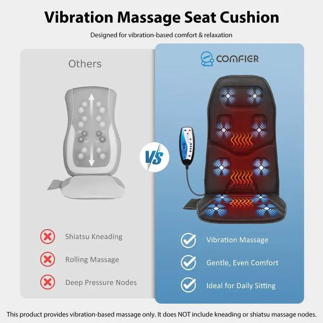 Comfier back massager for back pian features 10 vibrating motors and heat function to provide gentle massage for your back and thighs, helping to relieve stress, tension, and muscle pain.