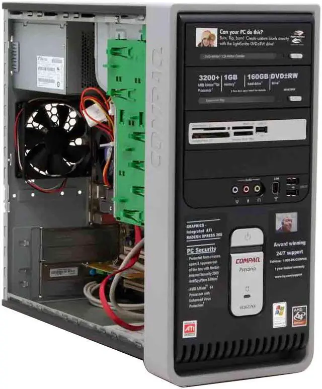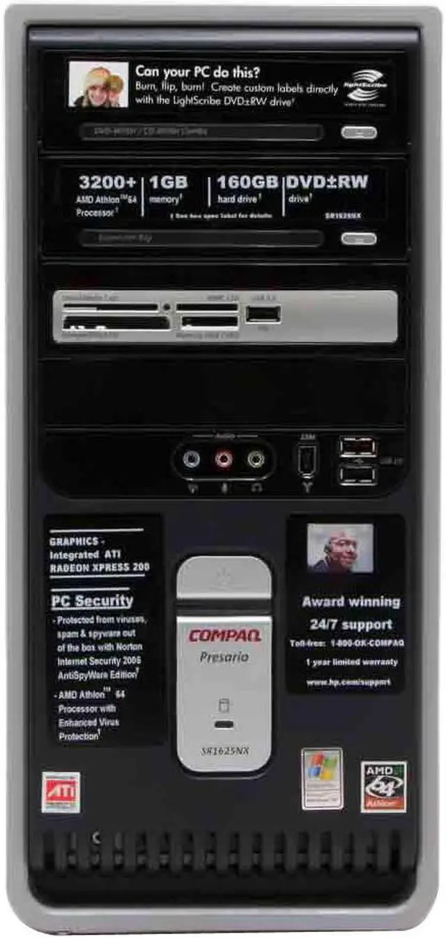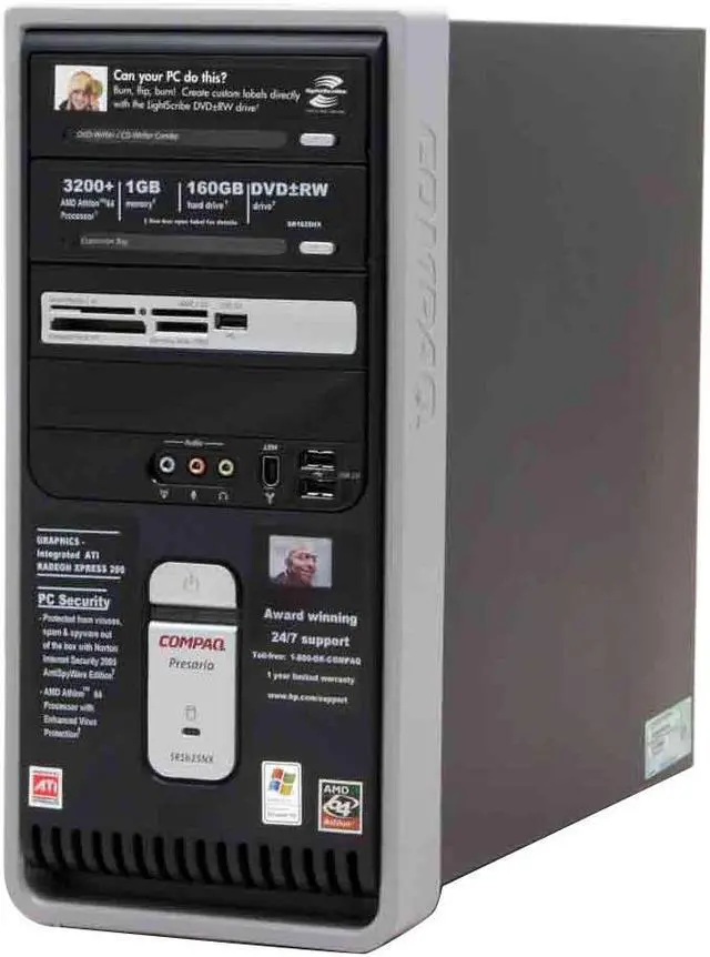 | Software Included | CD/CD-RW/DVD/DVD+RW WinDVD 5 Player Basic (with optional 7.1 upgrade) Sonic DigitalMedia Plus 7.02 Sonic MyDVD Plus 6.13 Education and Reference Microsoft Encarta Encyclopedia 2005 Standard (fc) MSN Encarta Standard (online) (nfc) Entertainment, Music, and Games iTunes 4.8 (w/Quicktime) Microsoft Plus Digital Media Edition LE (nfc) Real Player My Compaq Games Imaging, Photography, Video, and Film HP Software Update HP Image Zone Express 1.5 Productivity and Finance Adobe Reader Microsoft Works 8.0 Microsoft Office 2003 Student Teacher Edition Trial Microsoft Money 2005 (nfc) Quicken New User Edition 2005 (nfc) PC Security Norton Internet Security 2005 AntiSpyware Edition (60-day security update subscription) Norton Security Center Utility, Maintenance, and Performance Compaq Organize (nfc) PC-Doctor 5 for Windows HP Recovery Microsoft system restore HP Recovery Software Suite Software Repair Wizard Service and Support Compaq Connections Help & Support Center Desktop Web-based registration Online documentation ISP Signup Google toolbar Connectivity Support Tools (nfc) ISP offers HP Partner offers Snapfish Weatherbug Symantec Security Check |