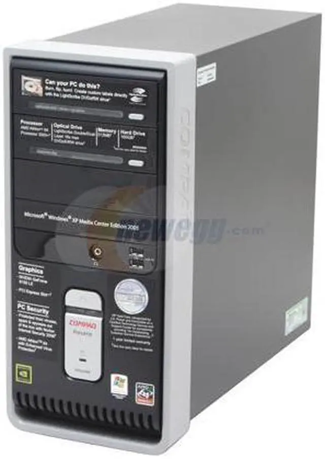 | Software Included | Operating System: Genuine Microsoft Windows XP Media Center Edition 2005 Windows Vista Capable PC PC Security: Norton Internet Security 2006: Protect your PC out of the box (60 days of complimentary live updates) Productivity: Microsoft Works 8: Includes a word processor, spreadsheet, database and calendar Quicken New User Edition 2006: Track your home finances and investments (English only) Microsoft Office Student and Teacher Edition 2003: 60-day trial version Microsoft Money 2006: Manage your personal finances and investments (English only) MSN Encarta Standard Online: Access a complete online encyclopedia, maps center, dictionary and thesaurus (1 year trial subscription included) Adobe Reader 7.0: Read and print PDF files Entertainment: Sonic DigitalMedia Plus-featuring LightScribe Technology: Edit, burn and archive data to DVDs and CDs Sonic MyDVD Plus: Make movies and slideshows and burn to DVD or CD HP Photosmart Premier: Organize, edit, share and protect photos DVD Play: Watch DVD movies RealPlayer: Find, play and organize digital programming-sports, entertainment, news and more |