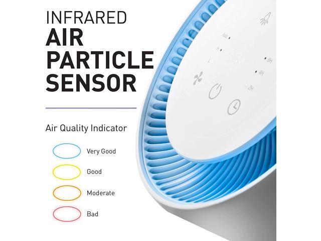 - Automatic Filtration Mode: Auto mode enables infrared sensor to automatically adjust fan speed from low, med, and high depending on the surrounding air quality while also changing the color of the LED indicator light to notify you of sudden changes