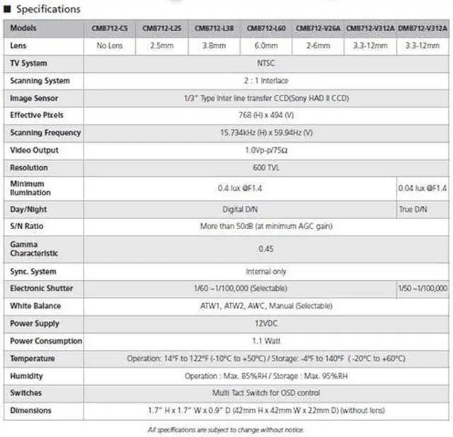 Computar Ganz High Quality CCTV CMB712-V26A 600 TVL Color Board Camera w/ 2-6mm Auto-iris Varifocal Lens