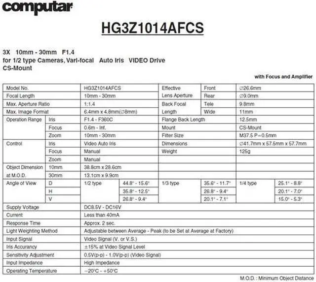 The computar HG3Z1014AFCS 1/2” Varifocal Telephoto Lens with Amplifier (10-30mm)
