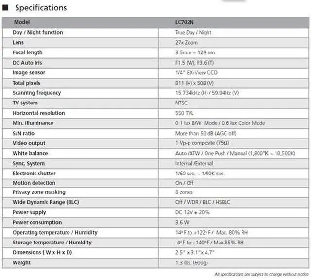 This all-purpose camera is ideal or industrial or surveillance applications. A Day/Night feature provides high-resolution color images during the day and high sensitivity B/W images at night. All camera functions can be controlled by push buttons on the back panel. In addition, zoom and focus can be controlled remotely through a standard controller.