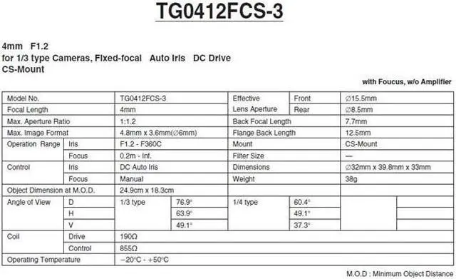 Computar Ganz High Quality CCTV Camera Lens TG0412FCS 1/3" 4mm f1.2 DC Auto Iris w/4-pin mini connector short cable (CS Mount)