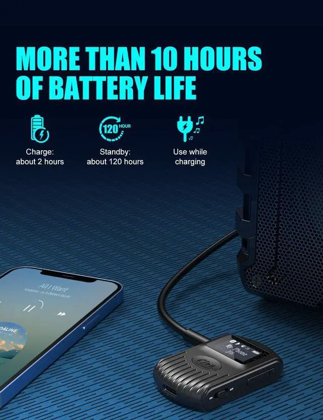 • [More Than 10 Hours of Battery Life]This Bluetooth audio receiver has a working time of more than 10 hours when making calls or playing songs, and a standby time of up to 120 hours. Using the included Type-C charge cable, it takes just 2 hours to fully charge the device. In addition, the high-efficient lithium-ion battery ensures that the device can be used safely while charging.