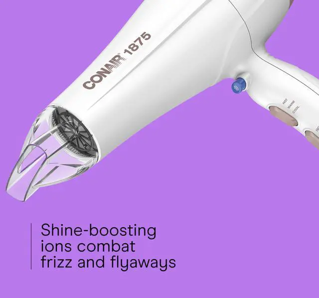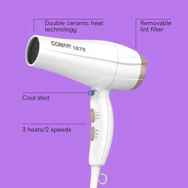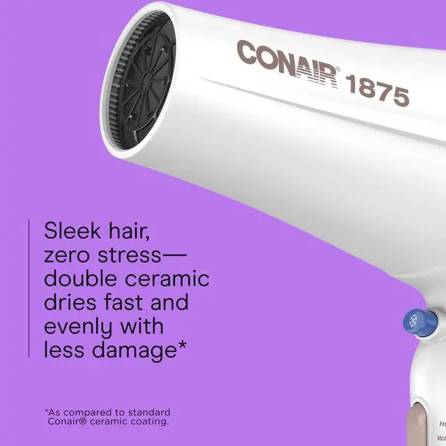 Sleek results with ease! Double ceramic technology. Powerful, fast drying, & conditioning ions. Get it all with the Conair® Double Ceramic Hair Dryer. This styling essential hair blow dryer with diffuser is your go-to for salon results at home made easy. Specially designed with double the ceramic technology, it dries fast with less damage. You get greater heat protection and healthy-looking hair. Infrared heat dries your hair evenly, thoroughly, and gently while 1875 watts gives you quick, powerful salon performance. Fed up with frizz? Win the battle with natural conditioning ions that banish frizz and boost shine. This blow dryer lets you choose from three heat & two speed settings for styling customized for your hair type. Use the diffuser to enhance natural curls and waves. Snap on the concentrator to focus airflow for smooth and sleek results. Once your style is just right, use the Cold Shot to lock in your look. There's even a lint filter to make it easy to prevent lint buildup and extend motor life of the diffuser hair dryer. At Conair®, we empower you along your hair journey with the latest hair tools and accessories that inspire the joy of change.