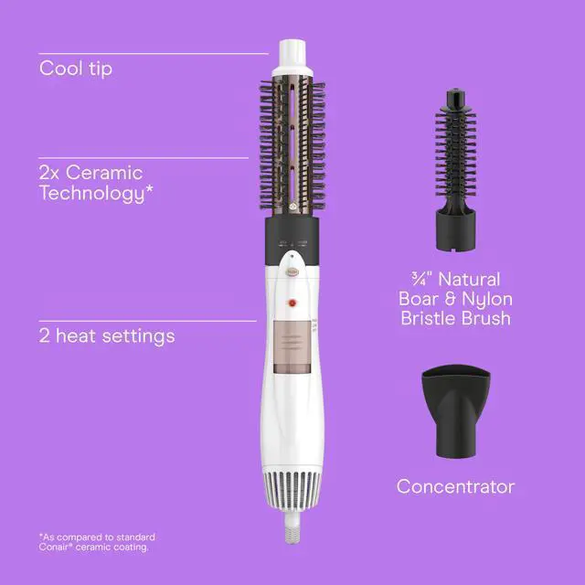 CURL OR STRAIGHTEN: With 1000 watts of power, this Conair Double Ceramic 3-in-1 Hot Air Brush features a 1¼-inch thermal brush to curl or straighten, a ¾-inch nylon and boar bristle brush to curl, and a concentrator for silky-straight results.