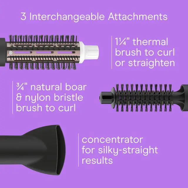 CHANGE UP YOUR LOOK: The included thermal brush and boar bristle brush attachments feature cool tips for easy swapping, so you can quickly change up your lookfrom sleek straight styles to bouncy curls and waves.