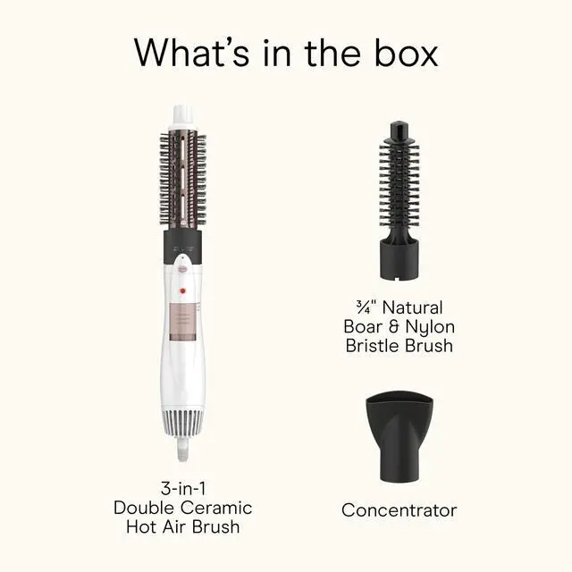 Double Ceramic 3-in-1 Hot Air Brush, Interchangeable Attachments: 1¼-Inch Thermal Brush, ¾-Inch Boar and Nylon Bristle Brush, and Concentrator, Voluminous Curls & Straight Styles, White