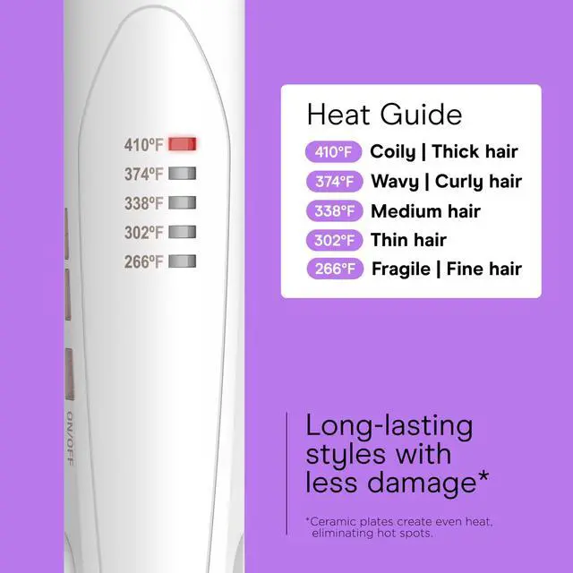 FAST STYLING: Smooth results in less time. With 5 heat settings up to 410°F, this Conair flat iron heats up quickly to protect against damage and keep your look lasting longer.