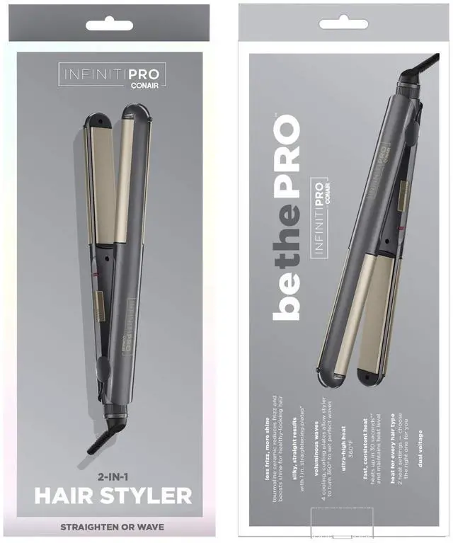 The INFINITIPRO BY CONAIR 2-in-1 styler's revolutionary designs allows you to straighten, curl and add body. This multifunction 2-in-1 tourmaline ceramic 1-inch flat iron / 1-inch curling iron uses high heat and Tourmaline Ceramic technology to create curls, waves and body effortlessly. It reaches stabilized heat within 30 seconds, maxing out at a hot 360 degrees for styles that make heads turn
