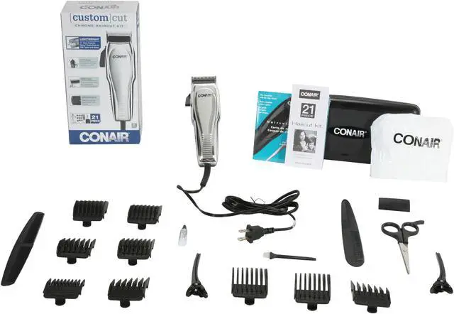 All-in-one Haircutting KitThe 21-piece Conair HC200GB kit includes a DC motor clipper, 9 attachment combs, barber cape, 2 styling clips, scissors, cleaning brush, oil, blade guard and more, providing all you need for haircutting.