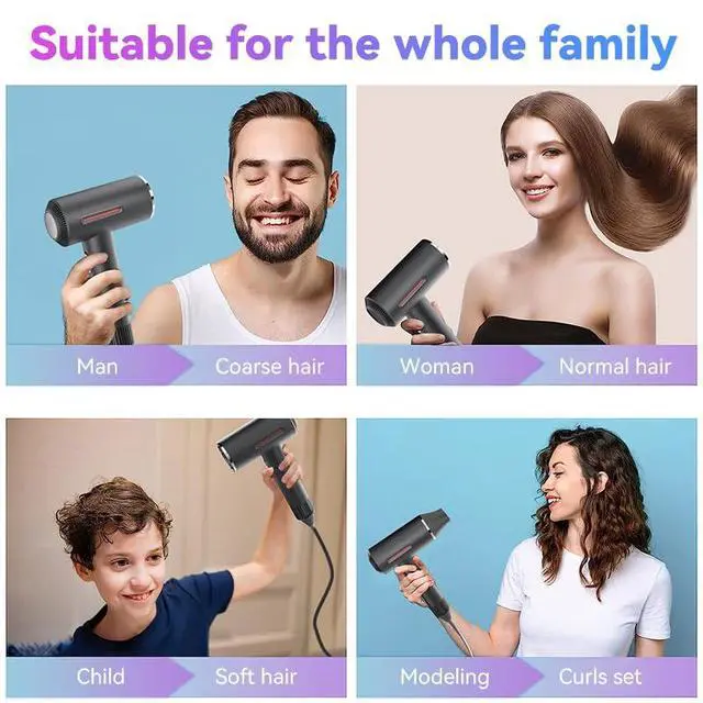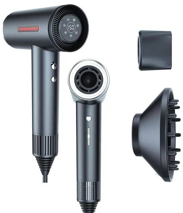 This high-speed ionic hair dryer is an essential hair tool for modern households. It utilizes advanced technology and design to provide you with an efficient and comfortable blow-drying experience. Firstly, this hair dryer is equipped with a powerful motor that generates strong airflow, significantly reducing drying time. Even for thick and long hair, it can quickly and effectively dry your hair, saving you more time. Secondly, the hair dryer utilizes ionic technology, releasing negative ions to neutralize static and frizz. This helps to make your hair smoother and shinier, reducing heat damage and promoting healthier hair. Additionally, the hair dryer offers multiple temperature and airflow settings, allowing for personalized adjustments based on different hair types and styling needs. Whether it's gentle breeze or strong airflow, the hair dryer can meet your specific requirements. The hair dryer is also equipped with a dedicated concentrator nozzle, which allows for precise airflow direction to achieve desired styling results. It helps in creating sleek and polished hairstyles with ease. With its powerful performance and thoughtful features, this high-speed ionic hair dryer is a must-have for anyone looking to achieve professional-quality hairstyling at home.