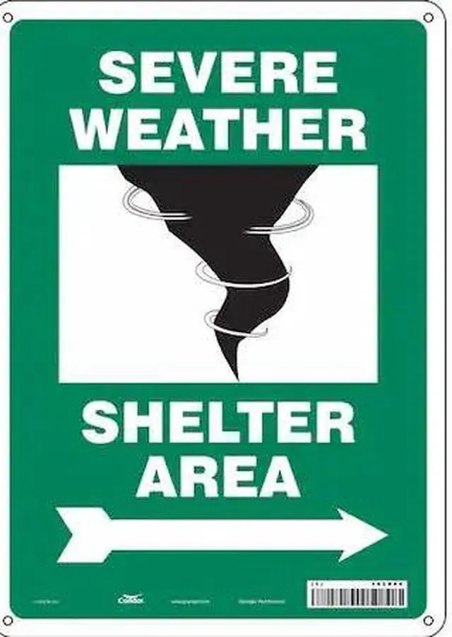 Safety Sign, Vertical Rectangle, Number of Printed Sides 1, English, Sign Legend Severe Weather Shelter Area, Sign Legend Background Color Green, Sign Legend Style Symbol and Text