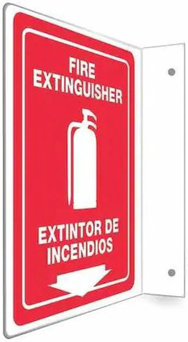 High Visibility Safety Sign, L-Shape Projection, Number of Printed Sides 2, English, Spanish, Sign Legend Fire Extinguisher/Extintor De Incendios, Sign Legend Background Color Red, Sign Legend Style Symbol and Text. This item has been restricted from sale in the following state (s): []