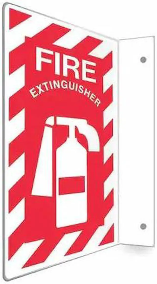 High Visibility Safety Sign, L-Shape Projection, Number of Printed Sides 2, English, Sign Legend Fire Extinguisher, Sign Legend Background Color Red, Sign Legend Style Symbol and Text. This item has been restricted from sale in the following state (s): []