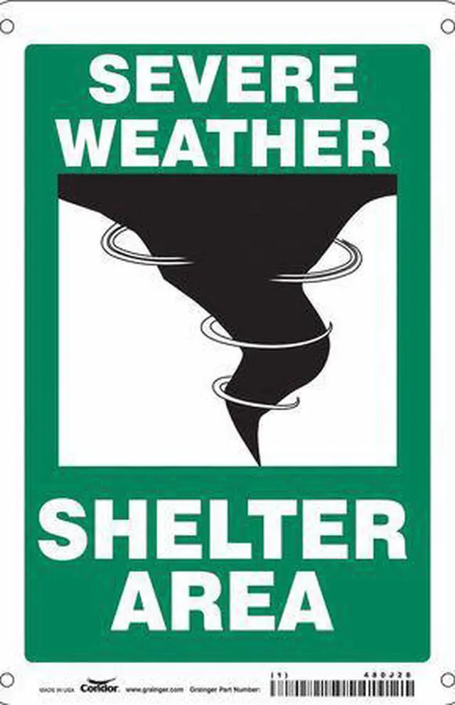 Safety Sign, Horizontal Rectangle, Number of Printed Sides 1, English, Sign Legend Severe Weather Shelter Area, Sign Legend Background Color Green, Sign Legend Style Symbol and Text