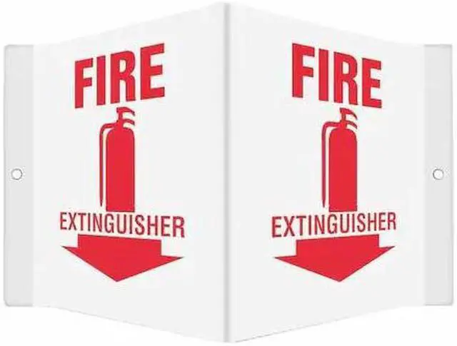 High Visibility Safety Sign, V-Shape Projection, Number of Printed Sides 1, English, Sign Legend Fire Extinguisher, Sign Legend Background Color White, Sign Legend Style Symbol and Text