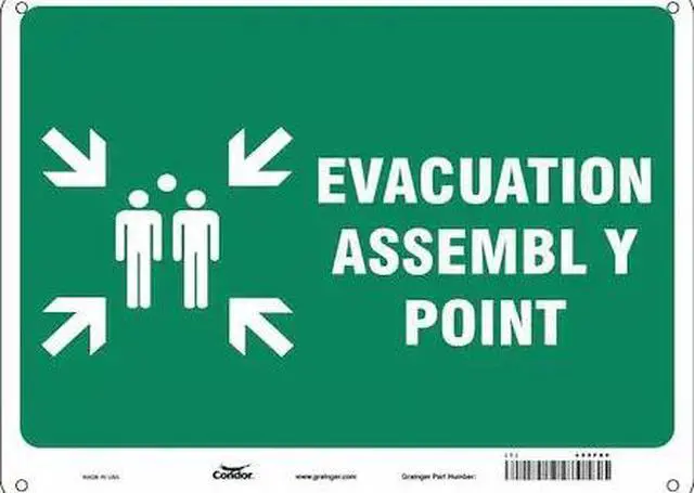 Safety Sign, Horizontal Rectangle, Number of Printed Sides 1, English, Sign Legend Evacuation Assembly Point, Sign Legend Background Color Green, Sign Legend Style Symbol and Text