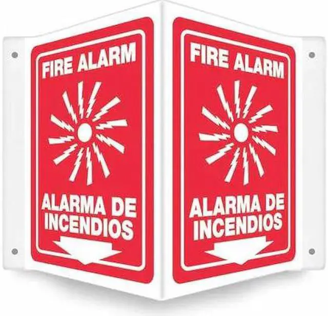 High Visibility Safety Sign, V-Shape Projection, Number of Printed Sides 1, English, Spanish, Sign Legend Fire Alarm/Alarma De Incendios, Sign Legend Background Color Red, Sign Legend Style Symbol and Text