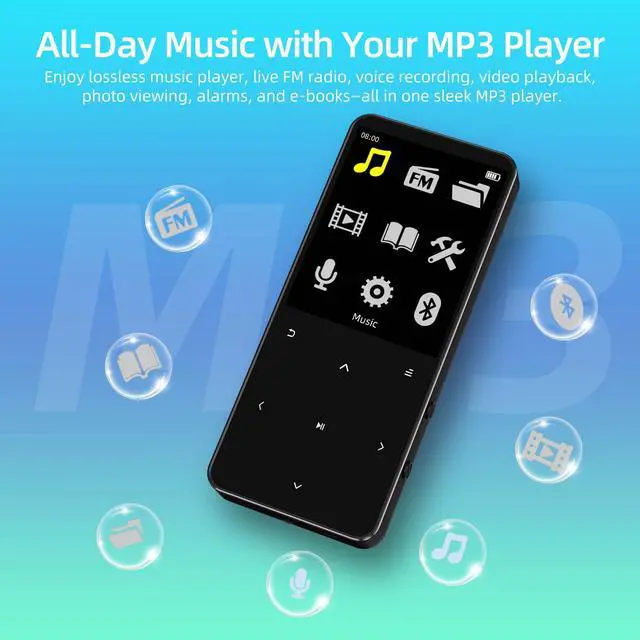 Why Choose Our MP3 Player? 1.8" Color Display This portable MP3 player features a clear, bright screen for easy browsing and navigation. Expandable Storage MP3 player with SD card slot supports up to 128GB Micro TF card (not included), for storing thousands of songs, audiobooks, and podcasts. Bluetooth 5.3 A Bluetooth MP3 player with stable connection and high-fidelity sound; connect to Bluetooth headphones or speakers for wireless listening (not compatible with phones or computers). Metal Body Design Premium aluminum alloy shell makes this digital music player stylish, durable, and long-lasting. High-Sensitivity Touch Keys + Independent Volume Buttons Intuitive and fast operation for a better user experience. FM Radio MP3 player with FM radio and auto-tuning function, supports 87.5108 MHz (wired earphones act as antenna). E-book Function Read TXT files with bookmarks and chapter selection, and even listen to music while-reading. Multiple EQ Modes Rock, Funk, Hip-hop, Jazz, Classical, Electronic, Custom for a rich, detailed audio-experience with this Hi-Fi MP3 player. Lyrics Sync Displays LRC lyrics while music plays. Multi-Language Interface Supports 12 languages for global users. Lightweight & Portable At 95×41×9.5 mm and only 42 g, this small MP3 player is suit for travel, sports, or commuting. Product Specifications Music Formats MP3, WMA, APE, FLAC, WAV, AAC-LC, M4A