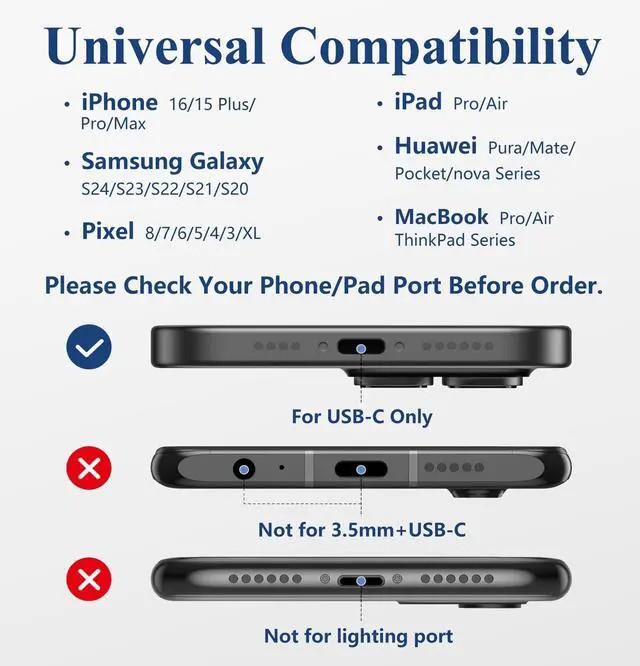 The usbc to aux adapter compatible with most USB-C devices, including popular models like iPhone 16, iPhone 15 , iPad Pro, iPad Air, iPad mini, Samsung Galaxy S25 Ultra/S25/S25+, Galaxy Tab S10/S9 FE, Pixel, Pixel Fold, Amazon Fire Max 11, and more.