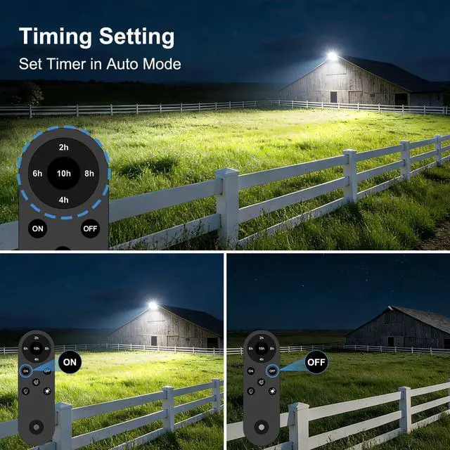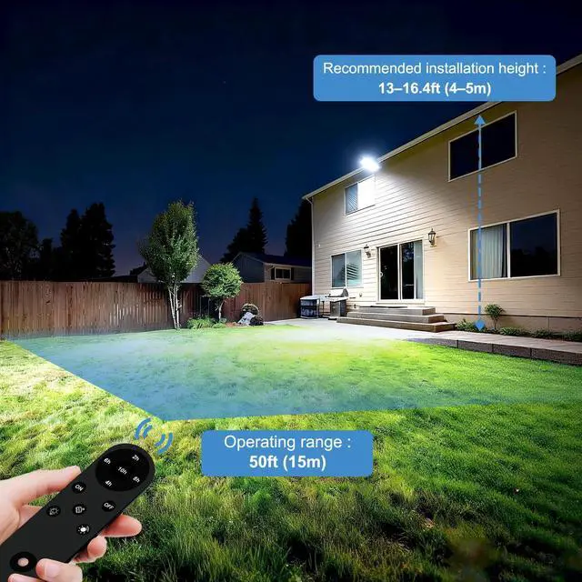 Merchant VideoThe flood light automatically turns on at dusk and off at dawn in Auto Mode. The included remote control offers multiple control options, allowing you to switch the light on or off manually or set a timer for scheduled shutoff—delivering flexible, convenient lighting tailored to your needs.