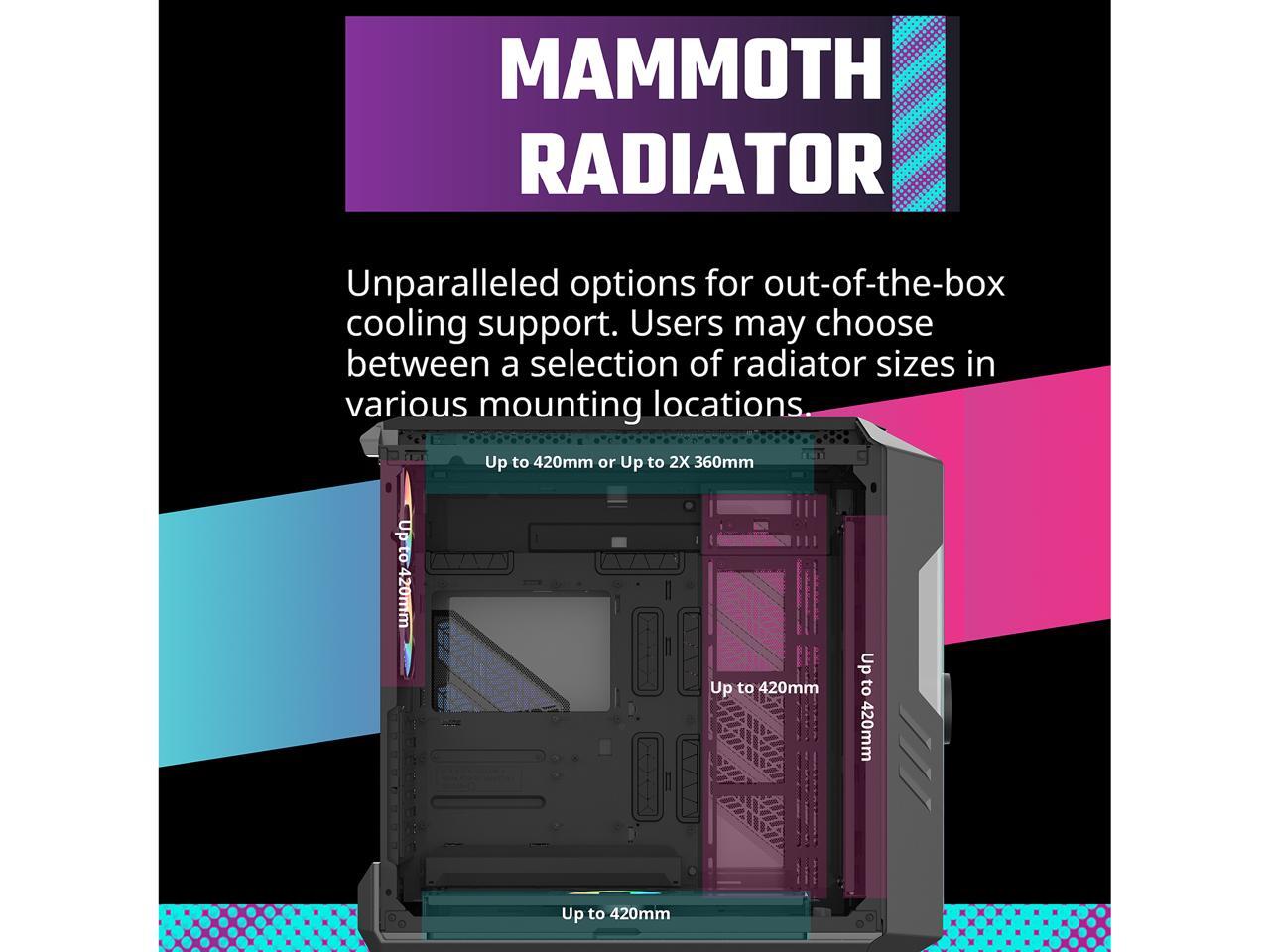 Mammoth Radiator: Unparalleled options for out-of-the-box cooling support. Users may choose between a selection of radiator sizes in various mounting locations.