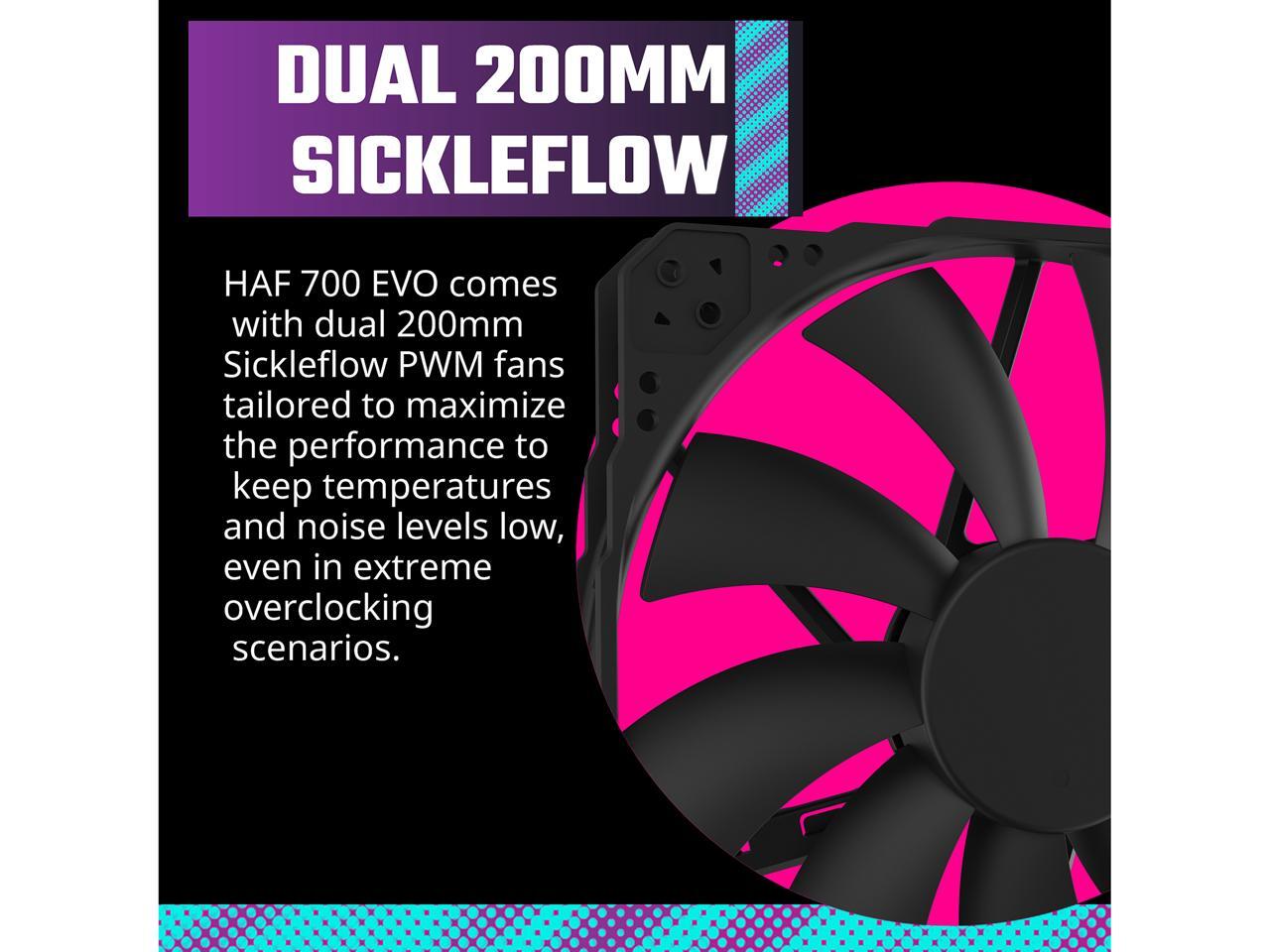 Dual 200mm SickleFlow: HAF 700 EVO comes with dual 200mm Sickleflow PWM fans tailored to maximize the performance to keep temperatures and noise levels low, even in extreme overclocking scenarios.