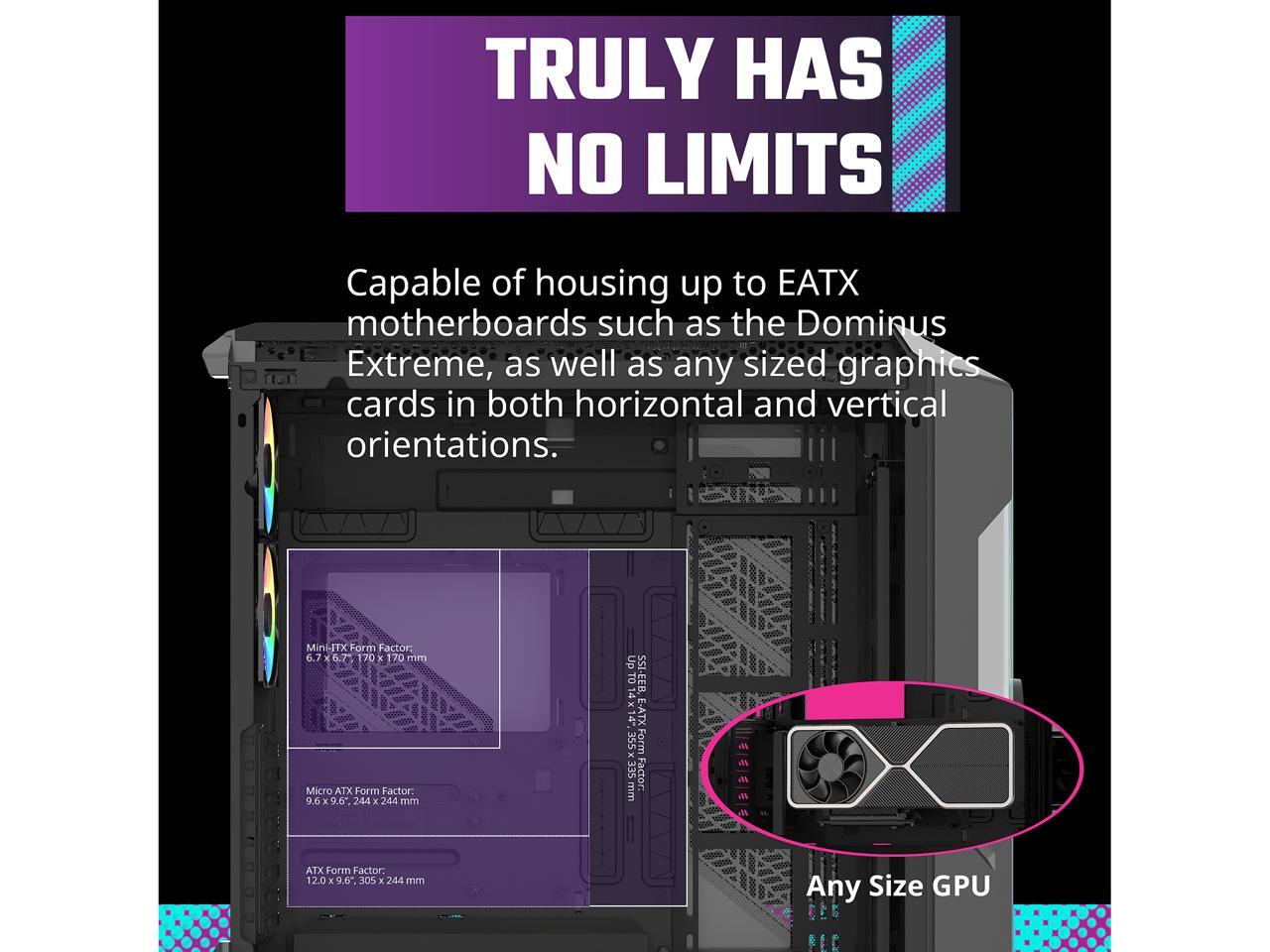 Truly Has No Limits: Capable of housing up to EATX motherboards such as the Dominus Extreme, as well as any sized graphics cards in both horizontal and vertical orientations.