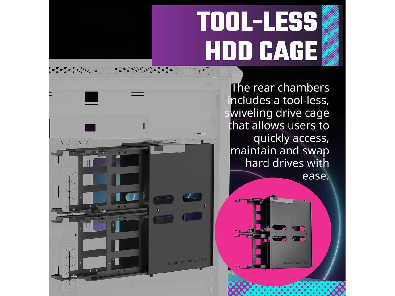 Tool-less HDD Cage: The rear chambers includes a tool-less, swiveling drive cage that allows us
