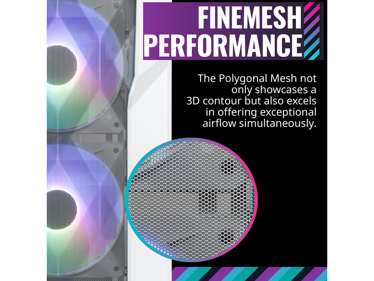 - Triple ARGB Fans: Three addressable RGB fans flood the Polygonal Mesh front panel with lighting while providing considerable airflow to the system.