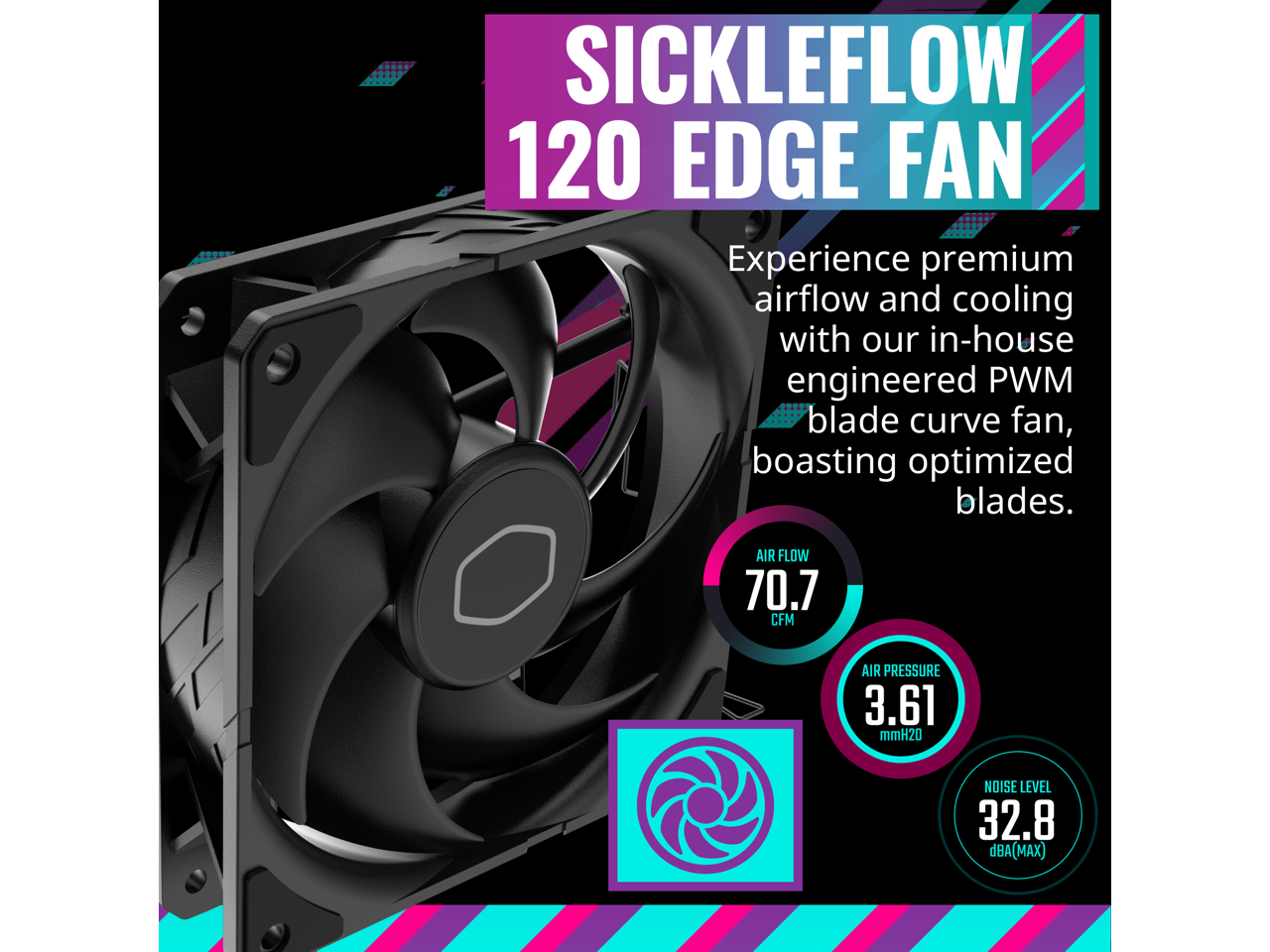 SickleFlow 120 Edge Fan: Experience premium airflow and cooling with our in-house engineered PWM blade curve fan, boasting optimized blades.