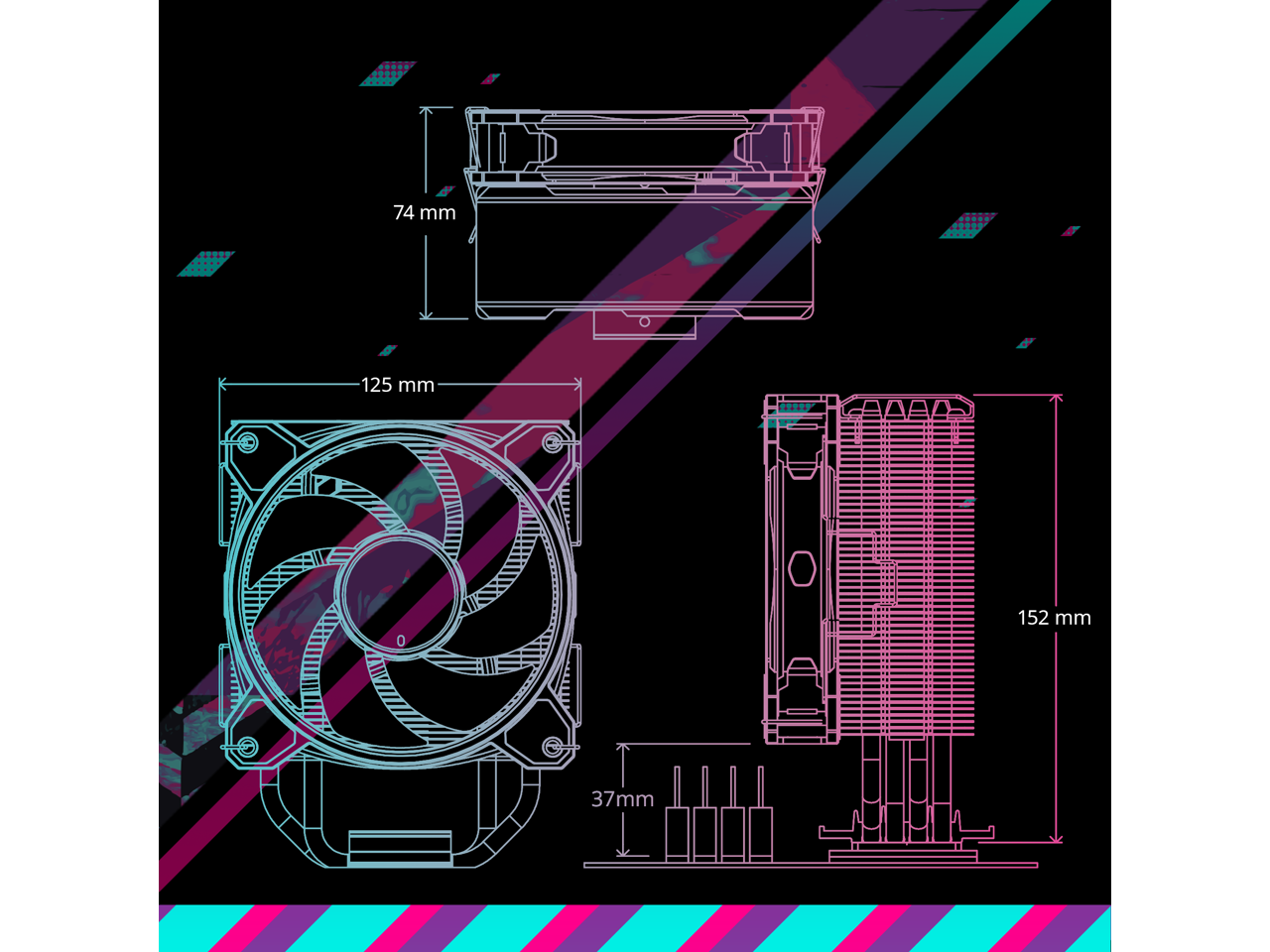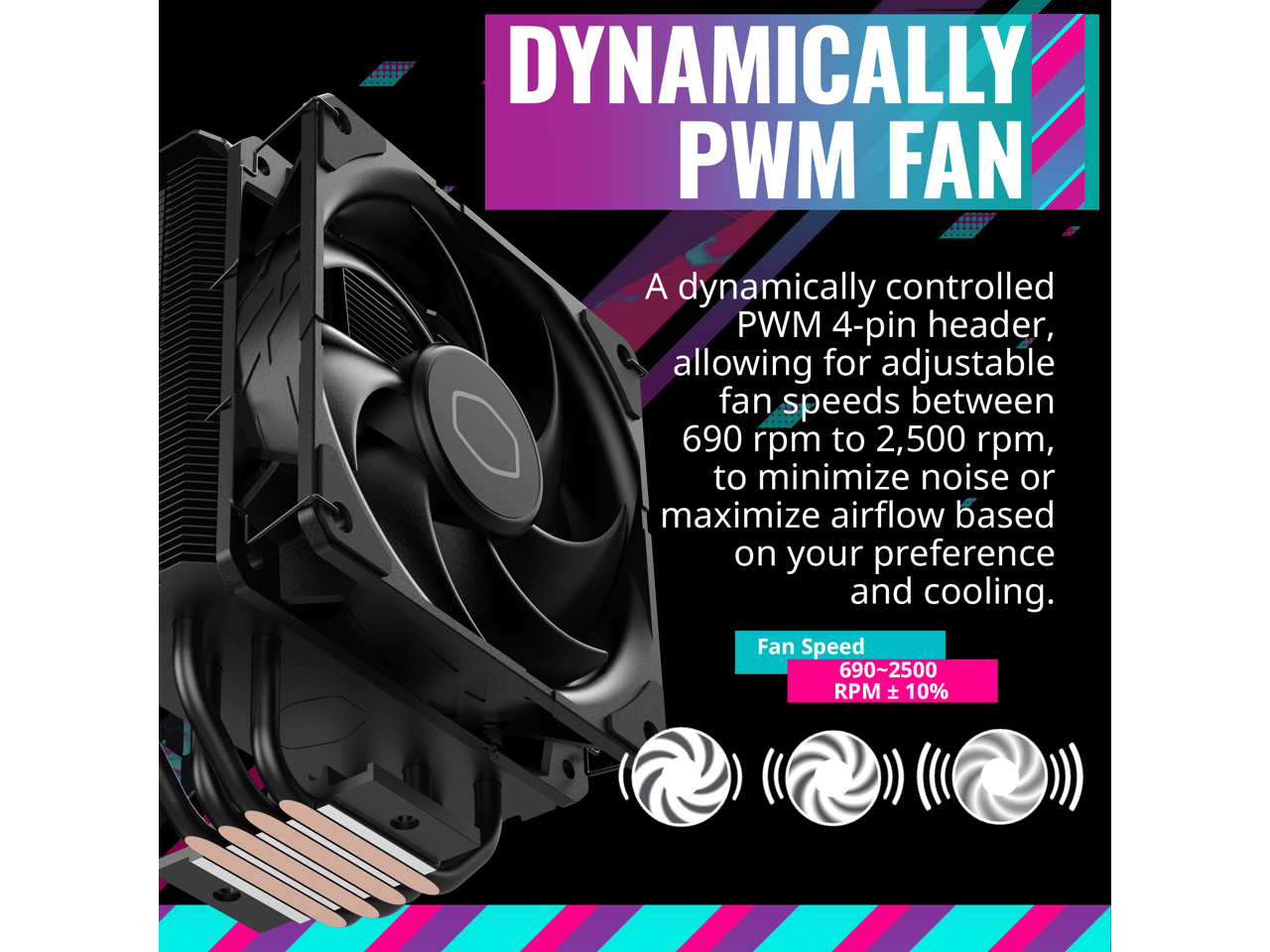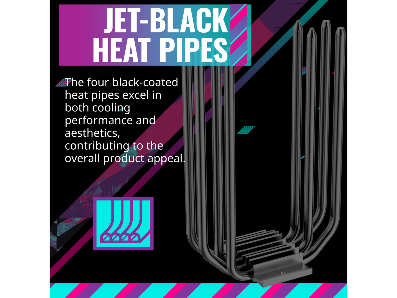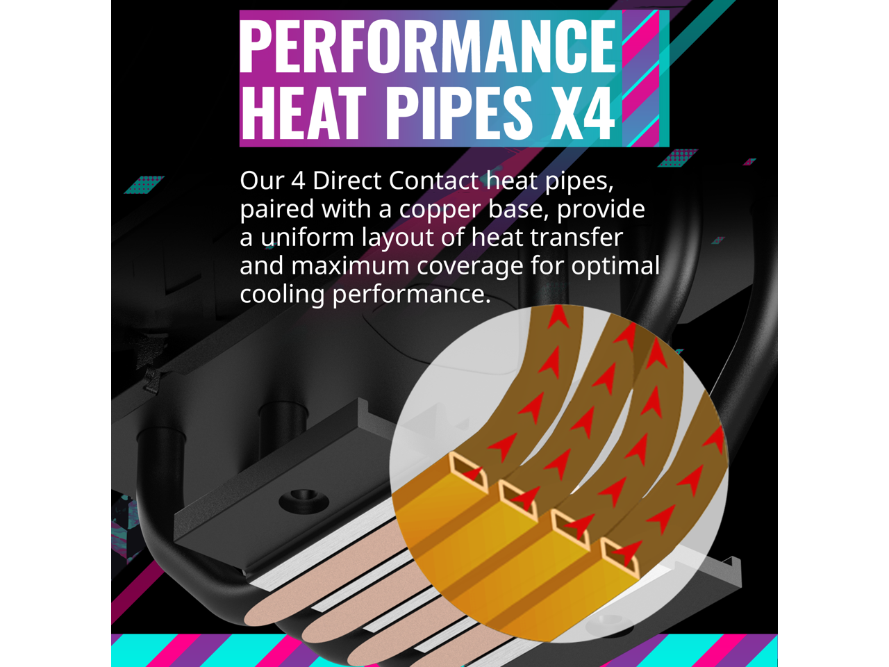 Performance Heat Pipes x4: Our 4 Direct Contact heat pipes, paired with a copper base, provide a uniform layout of heat transfer and maximum coverage for optimal cooling performance.