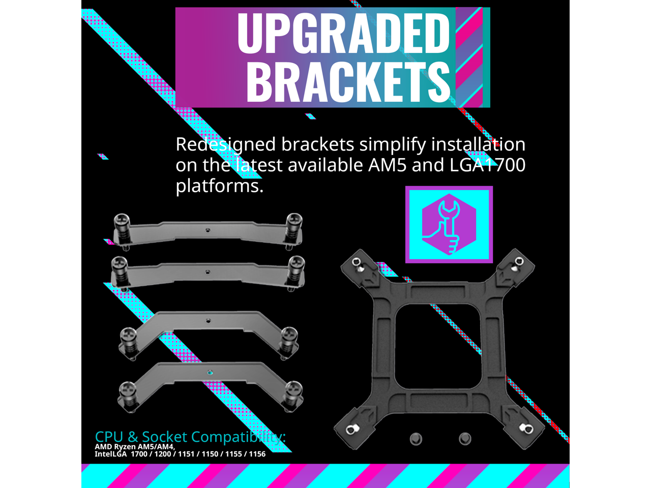 Upgraded Installation Brackets: Redesigned brackets simplify installation on the latest available platforms Intel: LGA1851, 1700, 1200, 115X / AMD: AM5, AM4