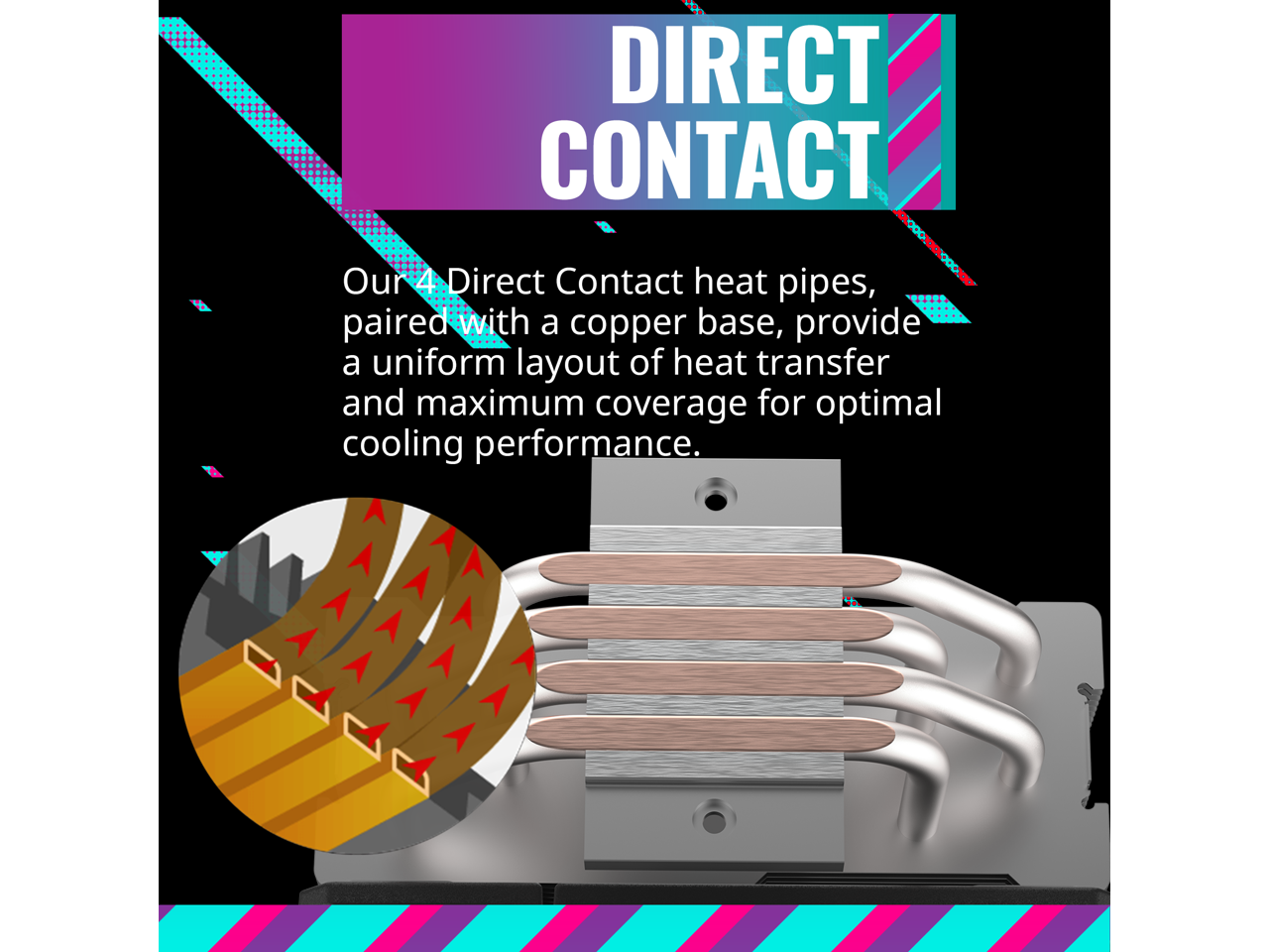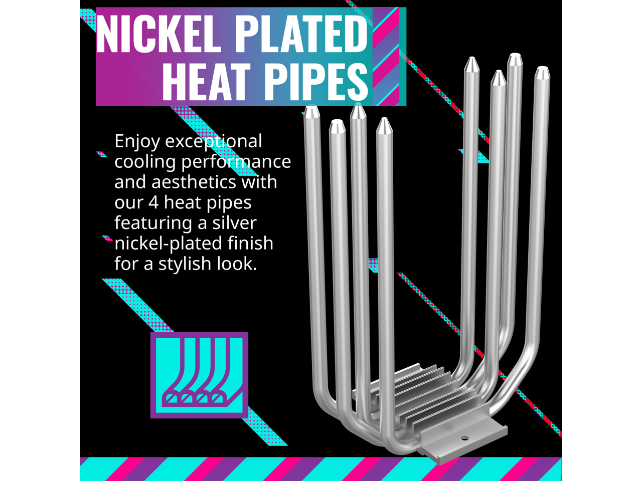 - Nickel Plated Heat Pipes: Enjoy exceptional cooling performance and aesthetics with our 4 heat pipes featuring a silver nickel-plated finish for a stylish look