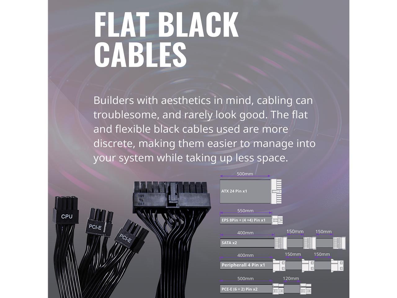 - Flat Black Cables: Flat cables to take up less space for easier cable management.