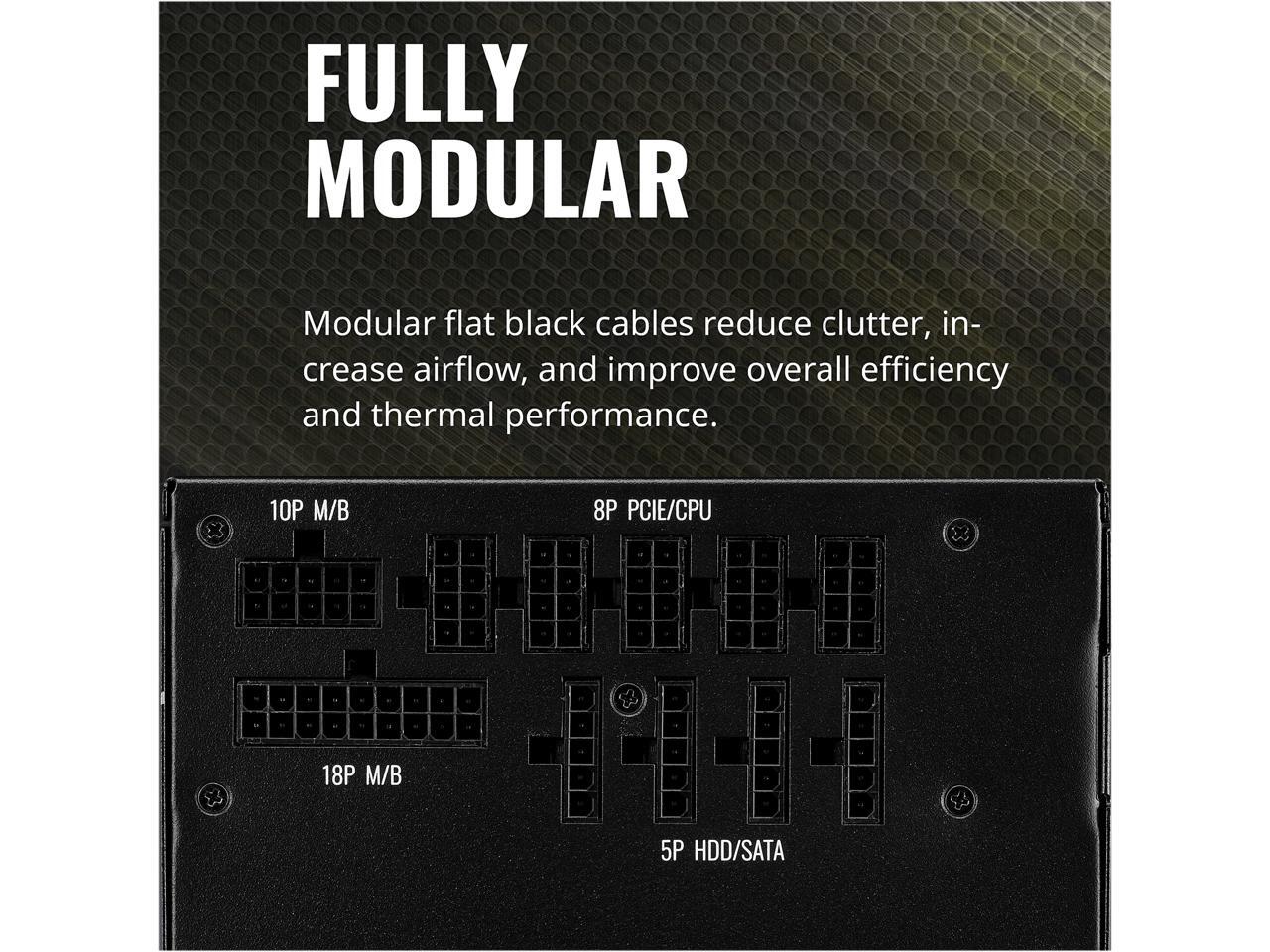 - Fully Modular: Modular flat black cables reduce clutter, increase airflow, and improve overall efficiency and thermal performance.