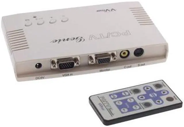 PC/TV Genie Computer to Video converter Take Standard HD-15 Monitor Output and Change to TV Composite or S-Video cable for standard TV or VCR output. Great for Presentations with a computer that is lacking video output. The PC/TV Genie accepts graphic data from PC(VGA) signal and converts them into video format (Composite S-VHS & analog RGB). It provide the best video quality and avoids noise problem. It is pure hardware design. Plug&Play is achieve by automatically detect the scan rate and resolution. Features True Plug and Play no software drivers required. Compatible with all PCs The scan rates up to 100Hz are supported for 640x480 resolution up to 85Hz for 800x600 resolution up to 75Hz for 1024x768 and up to 1152x864 resolution. True color quality. Simultaneous display both on TV screen and PC monitor. Support NTSC PAL and SECAM video system. (SECAM system displayed by analog RGB output port) Video output: Composite video S-VHS and analog RGB for SCART output. Support four push buttons combined with the OSD (on-screen-display) easy to control and change the function. Vertical / Horizontal scaling independent to meet all TV full screen. Horizontal/Vertical picture positioning. TV brightness sharpness 8-level flicker freeze frame control. Auto-Save of screen position brightness sharpness Remote controller