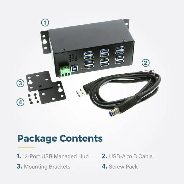 The USBG-12U3ML high-speed USB 3.0 hub allows you to connect 12 additional USB devices to your system. The industrial-grade chassis provides lasting durability for rugged use. Intended for use in numerous industries including but not limited to applications such as ATMs, Kiosks, Warehouses, Data Centers, and more.