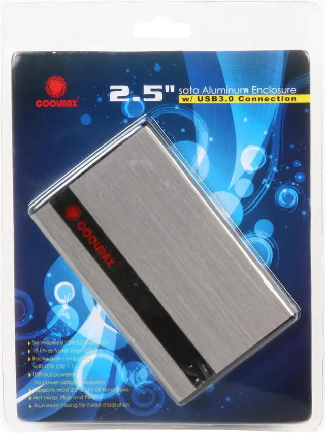 | Features | 10 times faster than USB 2.0 Backwards compatible with USB 2.0/ 1.1 USB bus powered, no power adapter required Supports most 2.5" SATA I/II hard drive Power and HDD Activity LED lights Hot swap, Plug and Play Aluminum casing for heat dissipation Compliant with USB3.0 Specification Revision 1.0 Compliant with USB Specification Revision 2.0 Support USB Super-Speed, High-Speed and Full-Speed Operation Bus bandwidth of USB up to 5Gbps Double Mounted USB 3.0 interface for Durability Compliance with Serial ATA Specification Revision 2.6 |