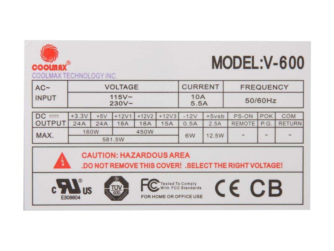 COOLMAX V-600 600 W ATX12V version 2.2 Power Supply