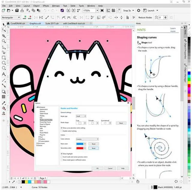 CorelDRAW 2017 simplifies shaping curves and objects by assigning each node type a unique shape, making it easy to identify smooth, cusp, and symmetrical nodes. You can also choose the node shapes that best suit your workflow.