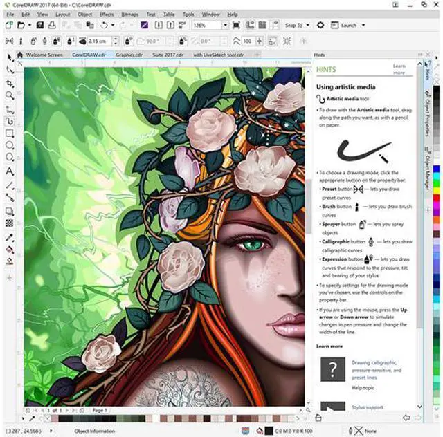Enjoy a more natural drawing experience and achieve more expressive results with the native support for Microsoft Surface, and advanced stylus support. A redesigned UI gives instant access to relevant controls and the ability to quickly choose which stylus properties to leverage. CorelDRAW Graphics Suite 2017 has been enhanced so you can take advantage of pressure, bearing, tilt, and rotation of your stylus to control a variety of tools and effects.