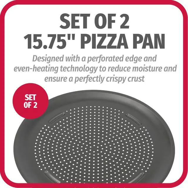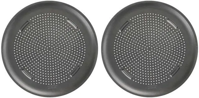 SET OF TWO 15.75" NONSTICK PIZZA PANS: Air-insulated and perforated to reduce moisture while baking frozen or homemade pizzas or heating up leftover slices to promote a crispier crust for a fresh taste