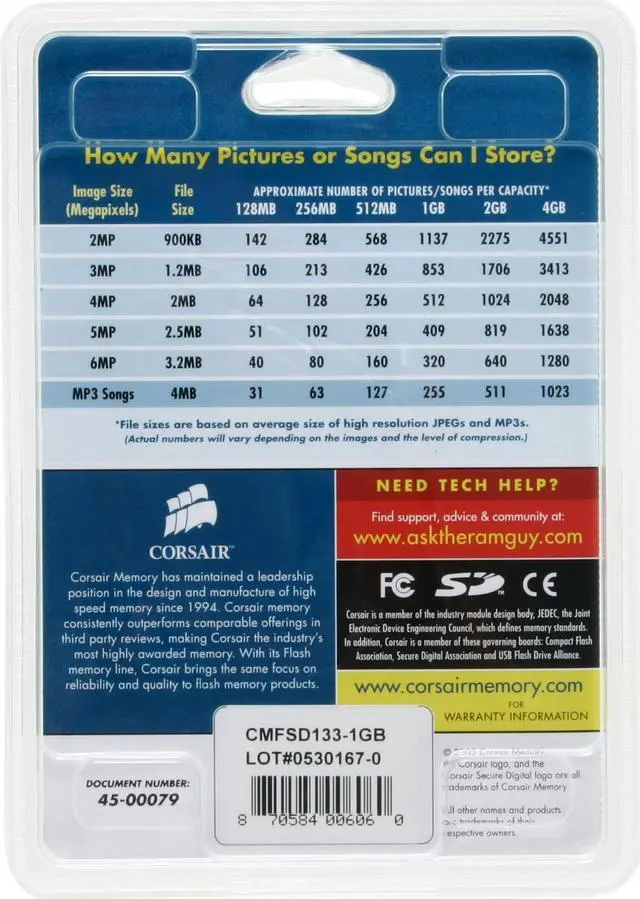 CORSAIR 1GB Secure Digital (SD) Flash Card Model CMFSD133-1GB