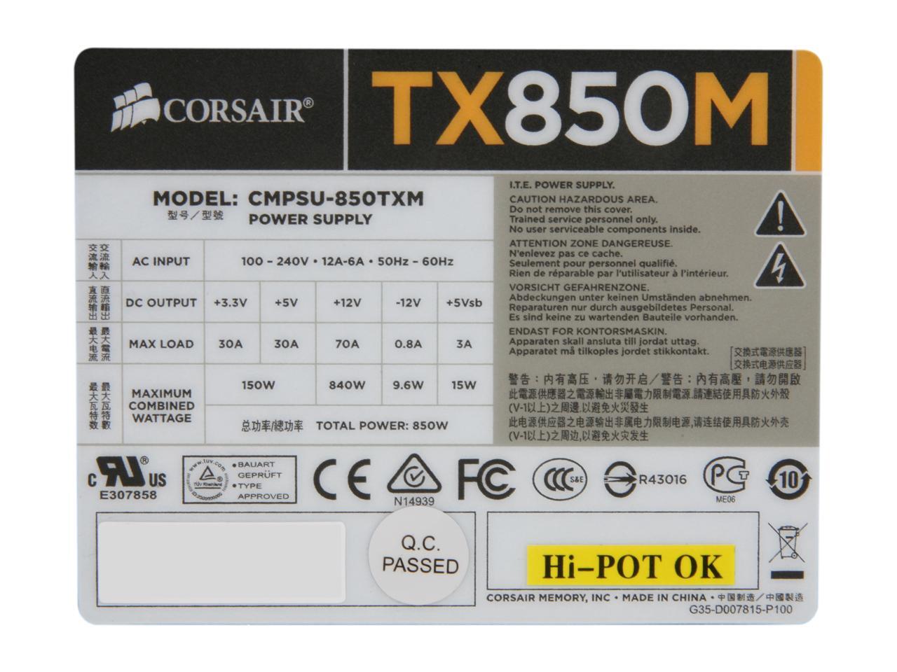 CORSAIR Enthusiast Series TX850M 850 W ATX12V v2.31 / EPS12V v2.92 80 PLUS BRONZE Certified Semi Modular High Performance Power Supply New 4th Gen CPU Certified Haswell Ready