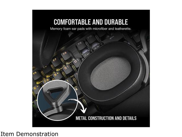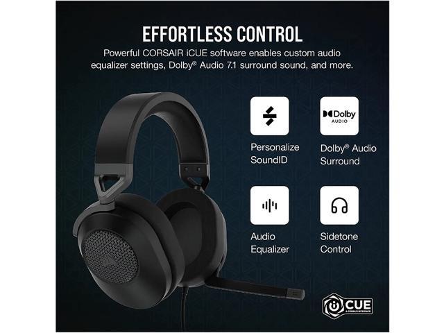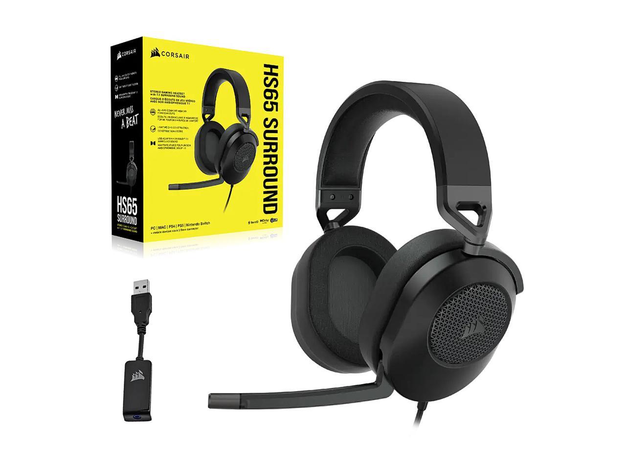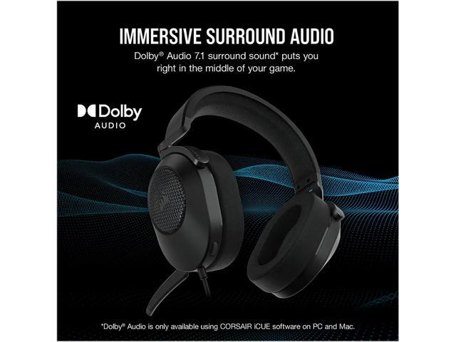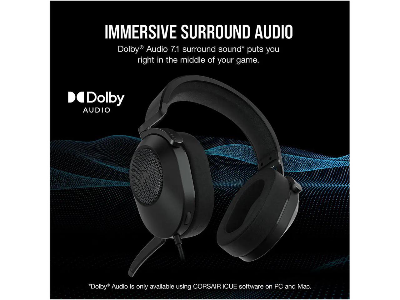 - The CORSAIR HS65 SURROUND Gaming Headset delivers all-day comfort and sound with memory foam leatherette ear pads, lightweight aluminum-reinforced construction, and Dolby Audio 7.1 surround sound on PC and Mac.