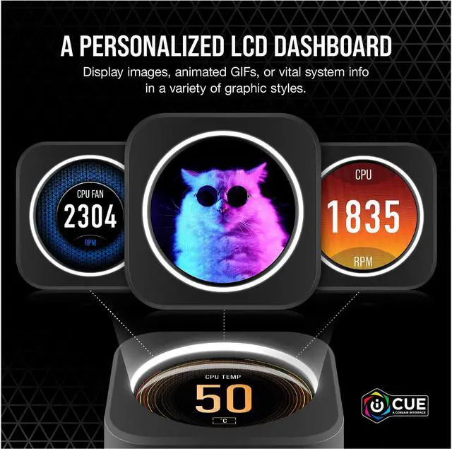CORSAIR iCUE software enables you to switch between a variety of display options such as fan speeds, CPU temps, images and GIFs, and more, adjust fan and pump speeds, and control and synchronize RGB lighting with all iCUE-compatible devices.