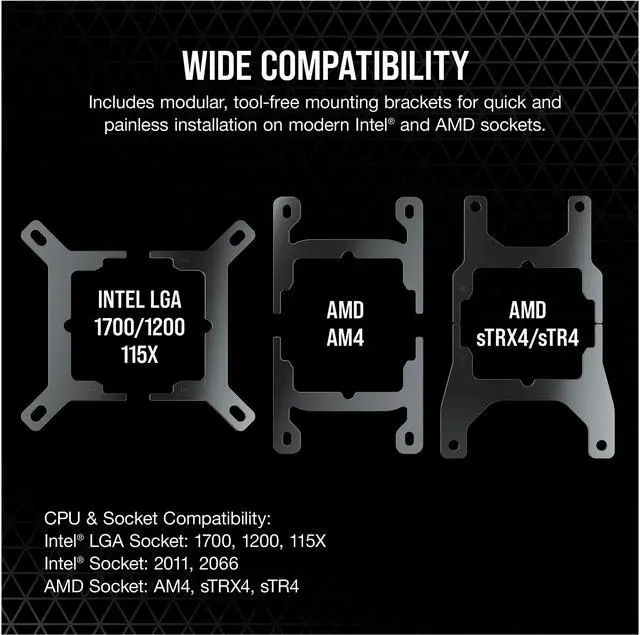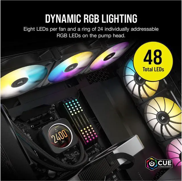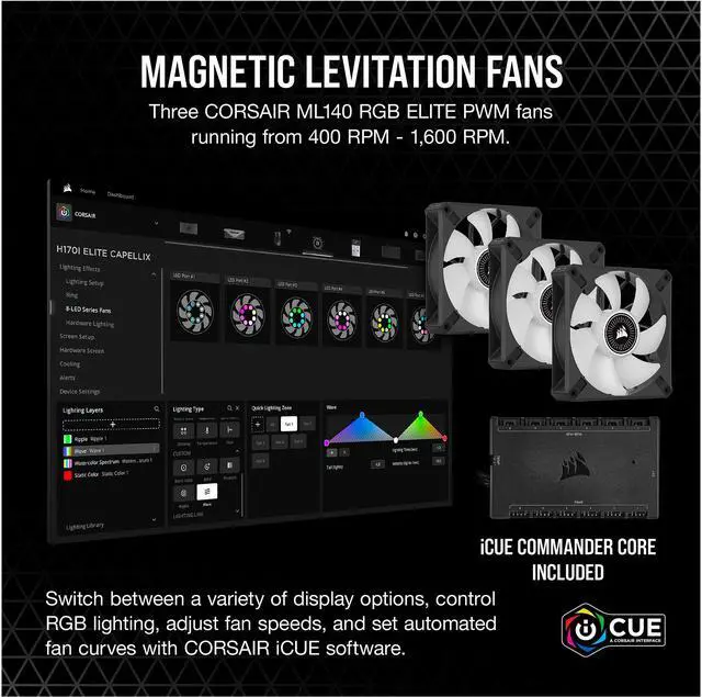 Three all-new 140mm CORSAIR ML RGB ELITE magnetic levitation fans with eight RGB LEDs per fan and AirGuide technology channel airflow for extreme CPU cooling performance.